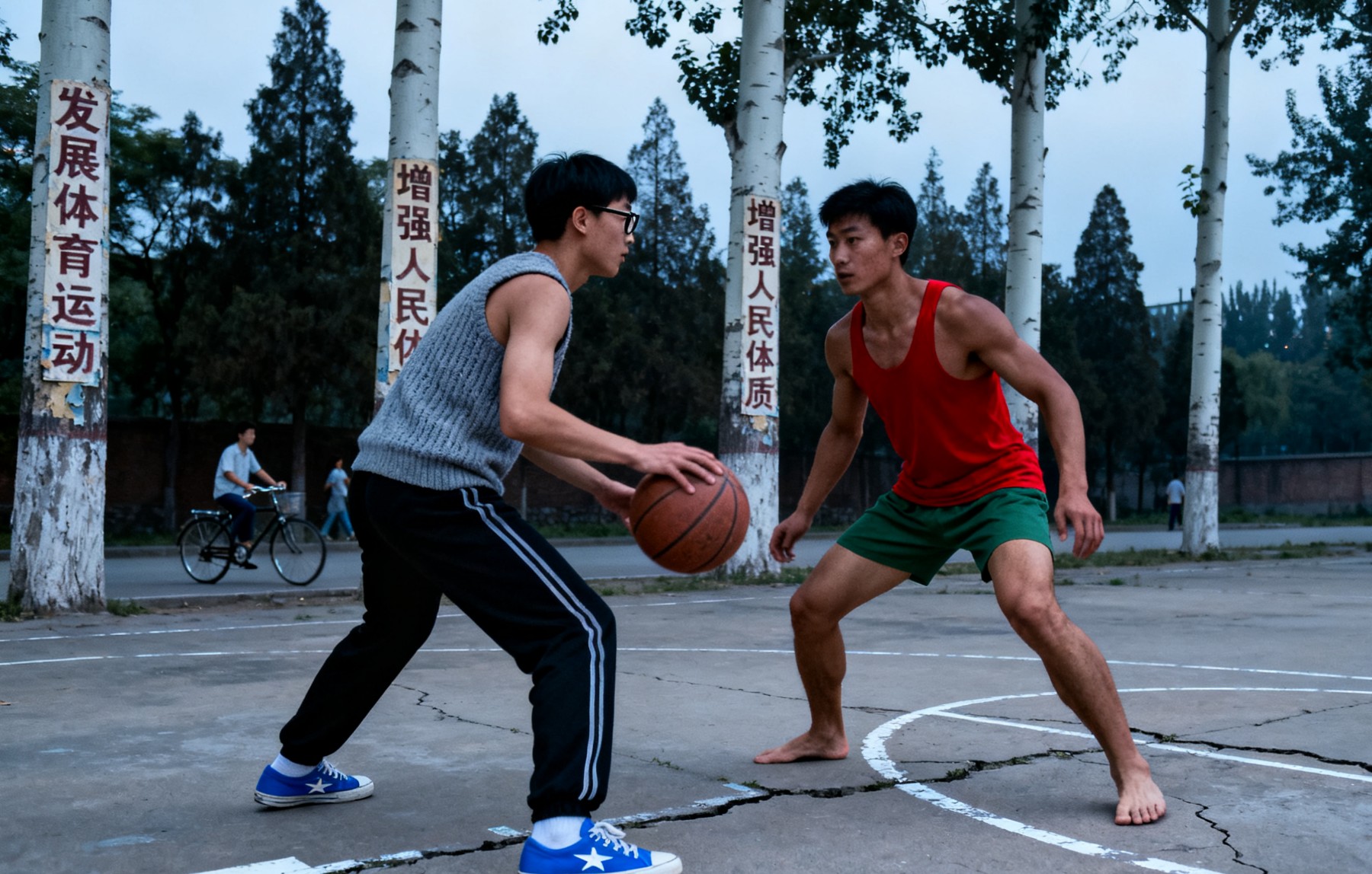 七九年我上师范,十七、八岁。我喜欢打篮球,常常参加比赛,没有球鞋,就光着脚丫子上场,很拚。有一天,刚参加完篮球比赛,又参加长跑,结果跑了第二名。那一幕场景,被师范的一位老师看见,他盯着我看了半天,对我说了一句话:“你这个娃子,难道是个铁人?”