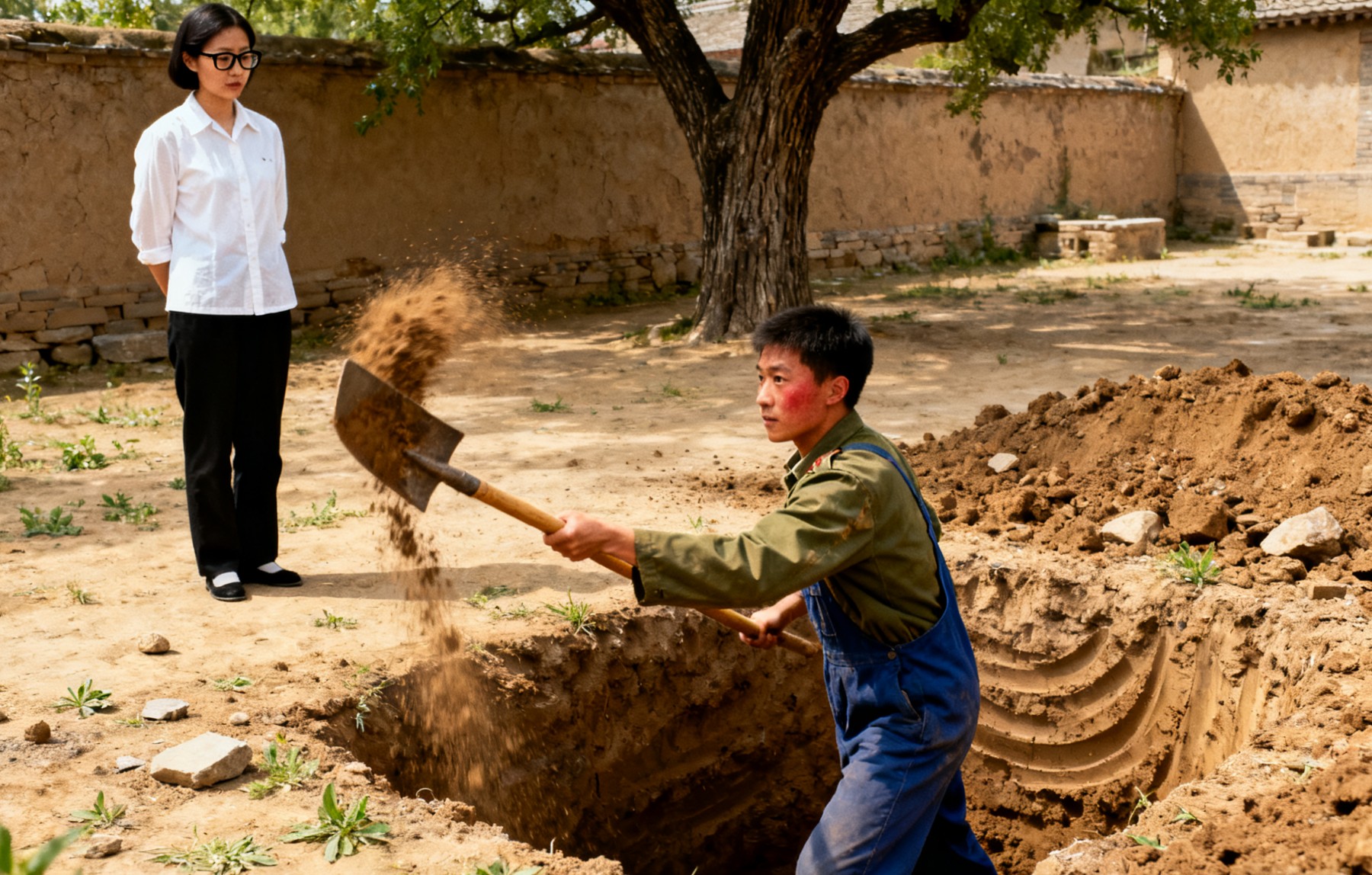 回到故事本身:那天刘老师走进我家院子大门,首先看到一大堆土,然后看到一个大坑,坑里有一个年轻人正在挥汗如雨挖坑,听见坑上面有人说话,抬头一看,竟然是刘老师,她坑边朝下面看着我,也是笑笑的。我惊喜地大叫了一声刘老师,赶忙从坑里爬上来。这样,刘老师算是见识了我在家里勤劳的样子。现在想起这个故事的时候,心里又是一阵悲伤——故事还在,人已经不在了。听同学说,刘老师在几年前去世了。
