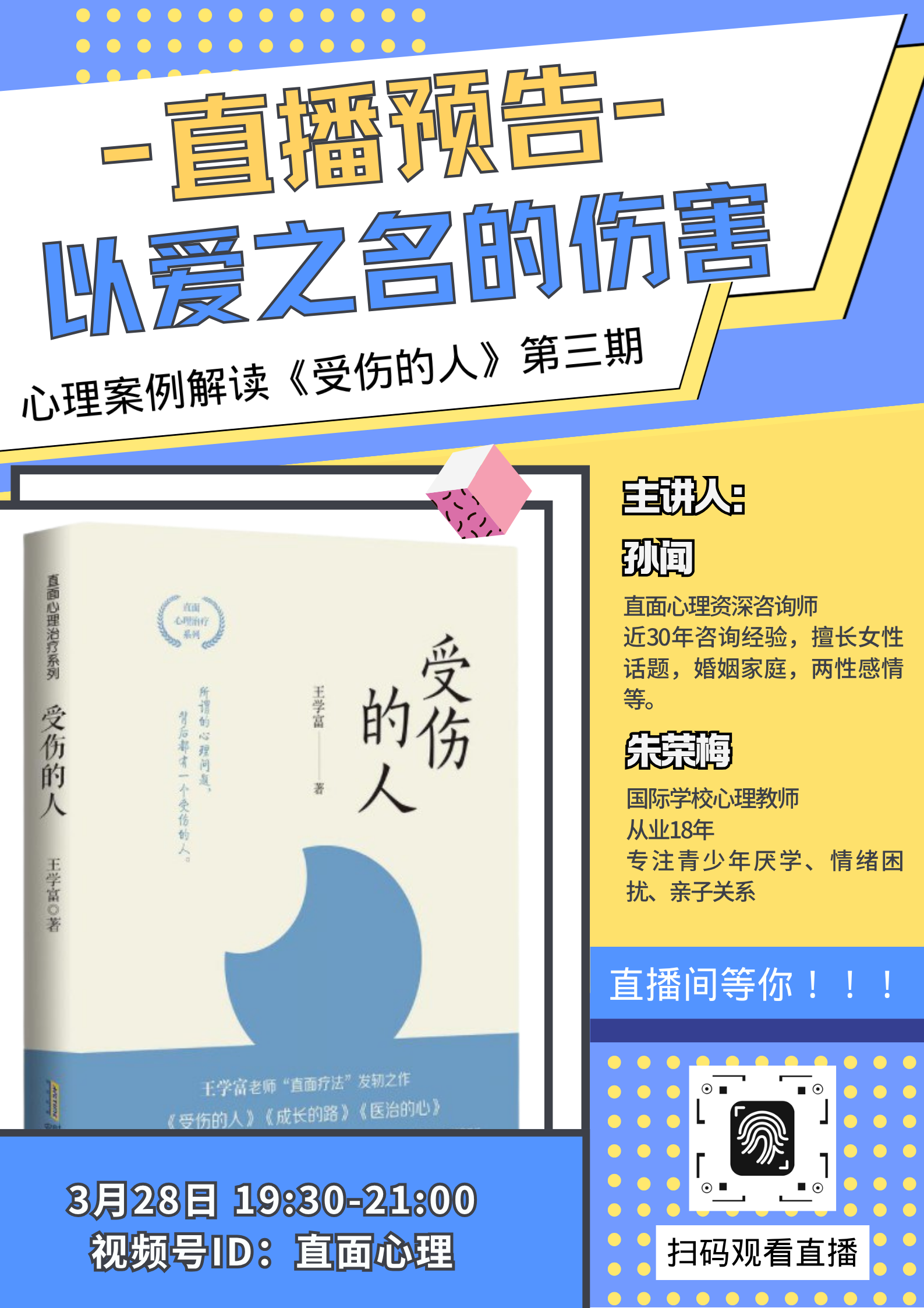3月28日晚19:30,锁定直播间,和孙闻老师、朱荣梅老师一起,翻开《受伤的人》第三章,撕开“为你好”的伪装,看见爱的真相,学会告别隐性伤害,拥抱更舒展、更真实的自己。