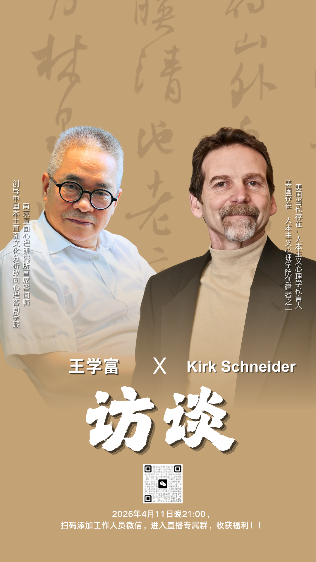 4月11日晚21:00,南京直面心理咨询研究所所长王学富博士,将与世界著名存在人本主义心理学家柯克·施奈德(Kirk Schneider)博士云端连线,以深度访谈的形式,解锁存在心理学的核心智慧,为心理学从业者、学习者及关注心灵成长的朋友,带来一场干货满满的思想盛宴。