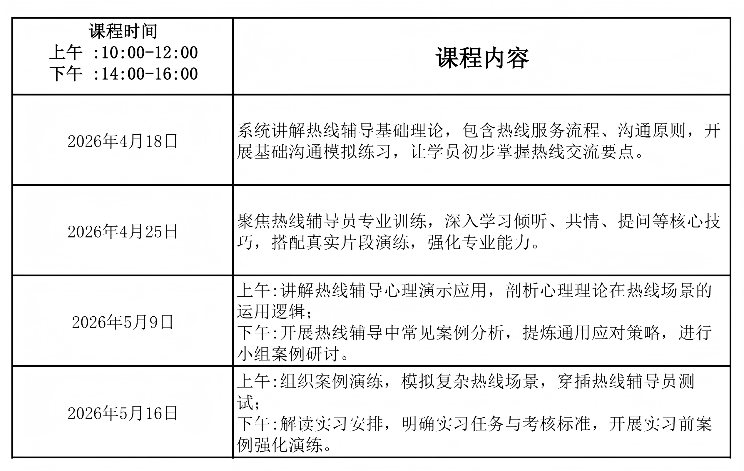 在大家的翘首以待中,2026年度直面热线辅导员培训即将开启!自4月18日开始,每周六上午10:00-12:00;下午14:00-16:00,由南京直面心理咨询研究所资深咨询师孙闻对热线辅导员进行四个周六的课程培训,培训内容丰富,形式多样。